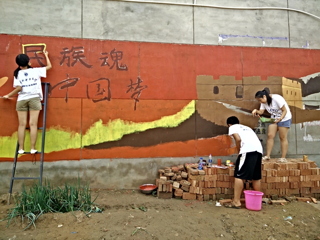 7月24日至26日,实践队进行了实地调研,经过与村委会的沟通交流,结合固安的文化特色,“民族魂 中国梦”主题文化墙绘制方案最终敲定。经过两天半辛苦的绘制,色彩绚丽的文化墙呈现在村民们眼前,得到了村民们的一致认可和赞赏。文化墙绘制过程中,队员们也不忘向老乡们宣传十八大精神,宣讲强农富农惠农政策,与老乡们一同畅想中华民族伟大复兴的中国梦。