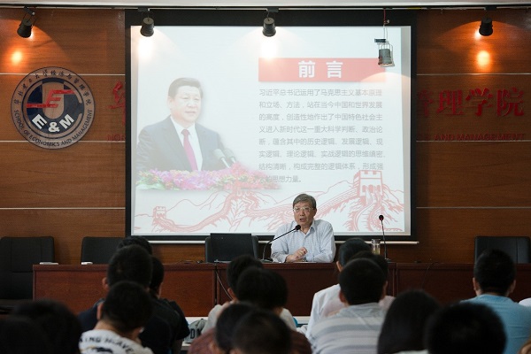 5月19日上午9点,党委研工部邀请原校党委副书记、关心下一代委员会主任朱常宝在教一207报告厅,为2017级研究生党支部书记培训班学员,带来了一场题为“认真学好习近平新时代中国特色社会主义思想,为实现中国梦努力奋斗”的专题讲座。朱常宝从历史逻辑、发展逻辑、现实逻辑、理论逻辑、实践逻辑等五个方面向在座党支书讲解了习近平新时代中国特色社会主义思想。