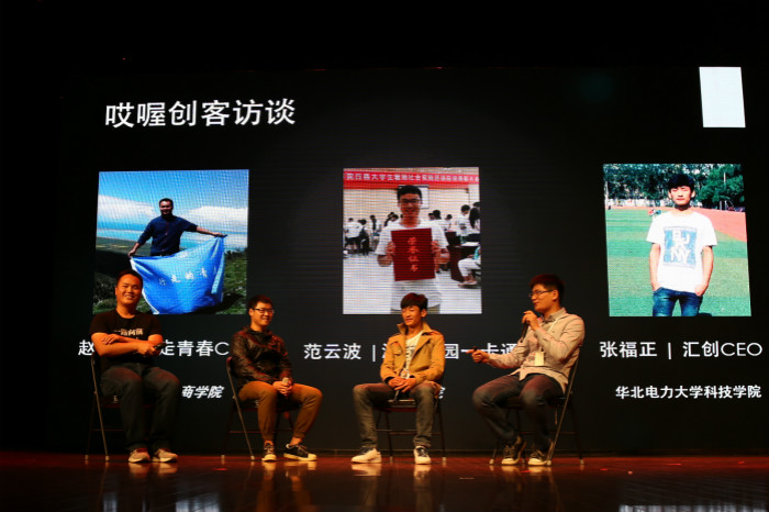 哎喔科技CEO刘少寒介绍了哎喔团队的技术团队与校园运营团队,讲述了这个团队一步一步组建起来的历程。他鼓励创业者要在有想法时就及时开始着手,一个好的创意不管多早开始起步都不会显得早。他秉承“创客,就是不甘平庸、敢于折腾的人”的想法与自己的团队从最基础做起,并运用众筹的方法进行集资和宣传。之后,刘少寒携同行走青春旅游公司CEO赵顺、沈丘校园一卡通创始人范云波、汇创科技创始人张福正也分享了自己的项目和创业路上的坎坷。