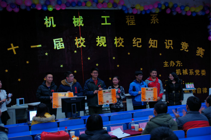 经过多轮角逐,第三组选手荣获一等奖,四、五组获二等奖,一、二、六组获得了三等奖。在颁奖结束后,齐岩讲话,谈到管理,他回忆起自己过去在自律会的经历,并说到一些基本生活习惯对个人成长的影响,同时他也对机械系自律会的辛苦工作给予了充分肯定,内容由最初的宿舍管理延伸到学习层面,劝慰同学们遵守校规校纪,保证较高的学习质量。
