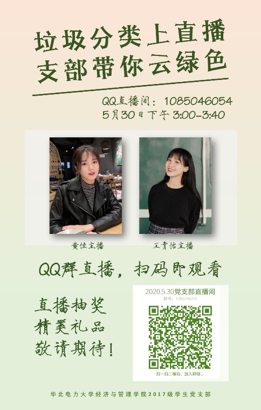 5月30日,华北电力大学经济与管理学院2017级学生党支部举办“垃圾分类上直播支部带你云绿色”专题直播党课,支部两名学生党员化身环保小主播,讲解垃圾分类政策,普及生态环保知识,校内外百余人积极参与,获得热烈反响。