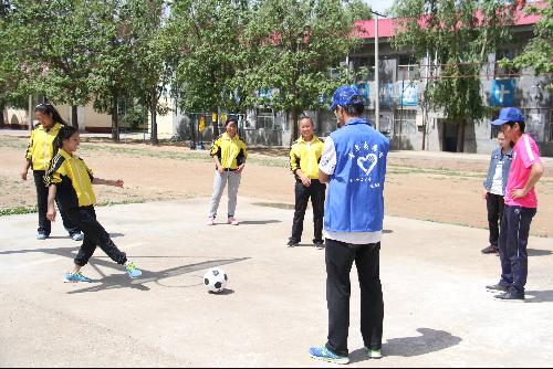 教室外的体育课堂中,孩子们对足球课显示出浓厚的兴趣。在简单热身后,孩子们分组后进行颠球、传球等的基本训练,志愿者们对一些基本动作进行规范化指导。之后的分拨对抗赛更是掀起了一阵高潮,志愿者与孩子们共同享受着足球运动带来的快乐,一时间欢声笑语充满了整个校园。