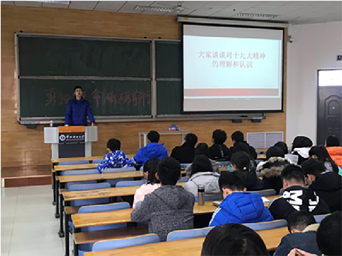 各院系以学习十九大精神为中心,以“勇担使命,砥砺前行”为主题,组织学生开展了精彩纷呈、亮点突出的十九大精神学习主题班会、主题党团日活动。一是班主任积极参与到学生十九大精神学习活动当中。英语1704班举办的主题班会中,班主任安国平老师带领同学们重温了习近平总书记的重要讲话,学习了十九大提出的新表述、新论断,同学们认为作为新时代的大学生应不忘初心,牢记使命,树立正确的价值观,勇于面对挫折、克服困难,承担起当代青年的社会责任,为“两个一百年”奋斗目标不懈努力。设制1601班班主任储开宇老师为同学们详细解读了十九大报告的内容,强调了学习十九大精神重要的政治意义和实践意义,要求同学们主动学习习近平总书记重要讲话精神,特别是对青年的亲切寄语,主动了解砥砺奋进的五年为中国带来的深刻变化。二是学习活动形式新颖,思想深刻。公管1704班的主题班会中,开展了“头脑风暴”,以“十九大”为核心词汇进行拓展,同学们将“新时代、复兴、小康、初心、民生、现代化”等词汇一一写在黑板上并进行阐释,很好地增进了对十九大的认识,还播放了原创视频《总书记十九大给青少年的礼物》。为扩大活动规模,还有班级联合举办学习活动,例如自动化1604班与测控1602班、能动1705班与能动1706班举办了十九大精神班级联合学习活动,增进了班级间的互动和交流,增强了活动效果。三是加强反馈,提升学习效果。为了增强同学们的学习效果,提高学习十九大的针对性,更好地开展下一阶段的学习,电气1601班精心制作了十九大精神学习问卷,在班会结束后分发给每位同学填写,并且及时进行总结。计算机1702班的同学学习完十九大精神后分成不同小组,通过知识竞赛的形式,不断强化学习到的十九大知识,增强了学习的趣味性,提升了学习效果。四是与大学生活密切结合,与自身专业紧密结合地开展学习活动。环境类1702班的同学们在学习中表示,作为环工系的青年大学生,应该勇于担当,肩负起创造绿水青山,与自然和谐共生的重要责任,将所学的本领应用到生态保护中去,与此同时,还要多关注家乡的环境发展,为家乡人民做出贡献。数理系、国际教育学院的同学们也结合本专业特点开展了十九大精神学习活动。五是线上线下结合,注重十九大精神的宣传。为了增强学习效果,通信1501班的同学们每人都制作了一份精美的手抄报,不仅深化了对十九大精神的认识,还强化了十九大精神的宣传。会计1502班、产品1602班等班级还通过十九大精神“微宣讲”等形式,在微信、微博等网络空间进行宣传。指尖新媒体工作室举办了“志存高远、脚踏实地,勇做时代的弄潮儿”横幅签名活动,制作了习近平总书记在十九大报告中寄语青年为主题的书签,开展了党的十九大知识问答线上线下主题宣传活动等,在广大学生中积极宣传十九大精神,营造了良好的学习宣传氛围。