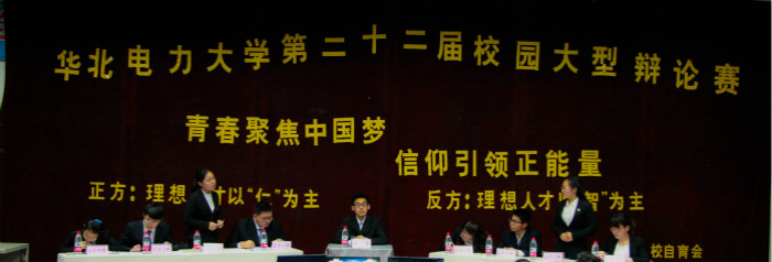 本网保定讯:5月12日晚7时,由校自育会主办,校团委以及校学生团体联合会承办的“青春聚焦中国梦,信仰引领正能量”第二十二届校园大型辩论赛在教六二阶成功举办。自育会原主任董冬阳及各社团负责人和各院系团委副书记作为嘉宾出席本次比赛。校工会原常务副主席田禾,法政系副主任夏珑,校长办公室于海龙和两位资深辩手担任评委。