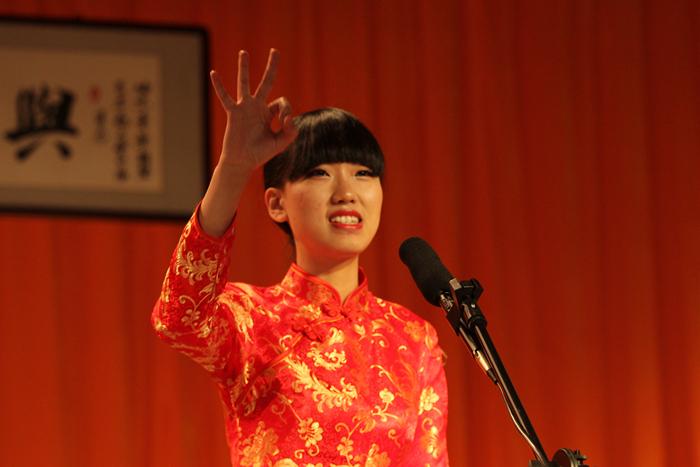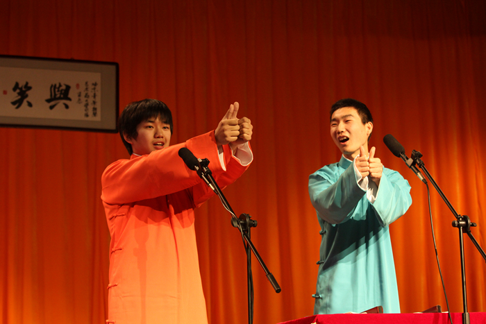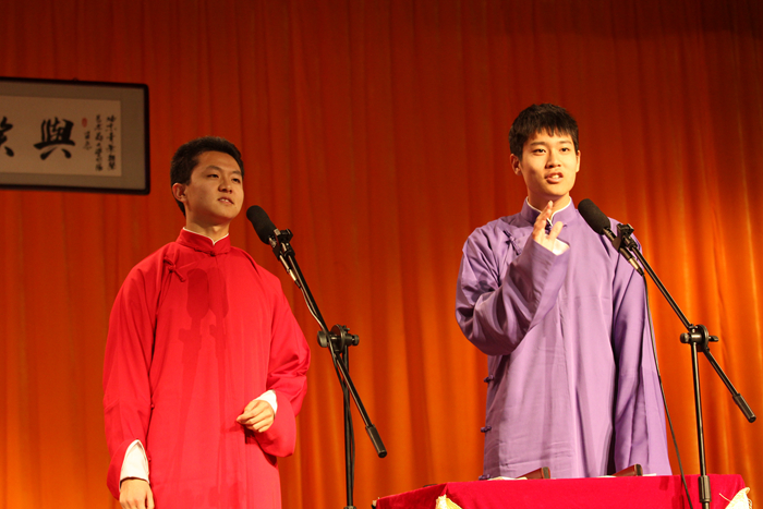 率先为我们带来笑声的是富含丰厚文化气息的《八扇屏》。演员们博古通今,古往今来旁征博引,在浓浓的古典文化气息中又不乏现代的讯息,赢得观众的阵阵欢笑和热烈的掌声。接着,大一新生的新鲜血液也为一笑堂这个欢乐的大家庭注入生机与活力。《学聋哑》中演员惟妙惟肖的表演,让我们深深感受到来自相声艺术的独特魅力:聋子打岔,哑巴说话,两个人默契配合,生动有趣,台下掌声雷动,经久不息。随后,来自北京中医药大学的特别来宾李盼和景原野用他们生动的肢体语言为我们演绎“大保镖”的故事。他们妙语连珠,字字珠玑,使观众都沉浸在现场欢乐的氛围中。