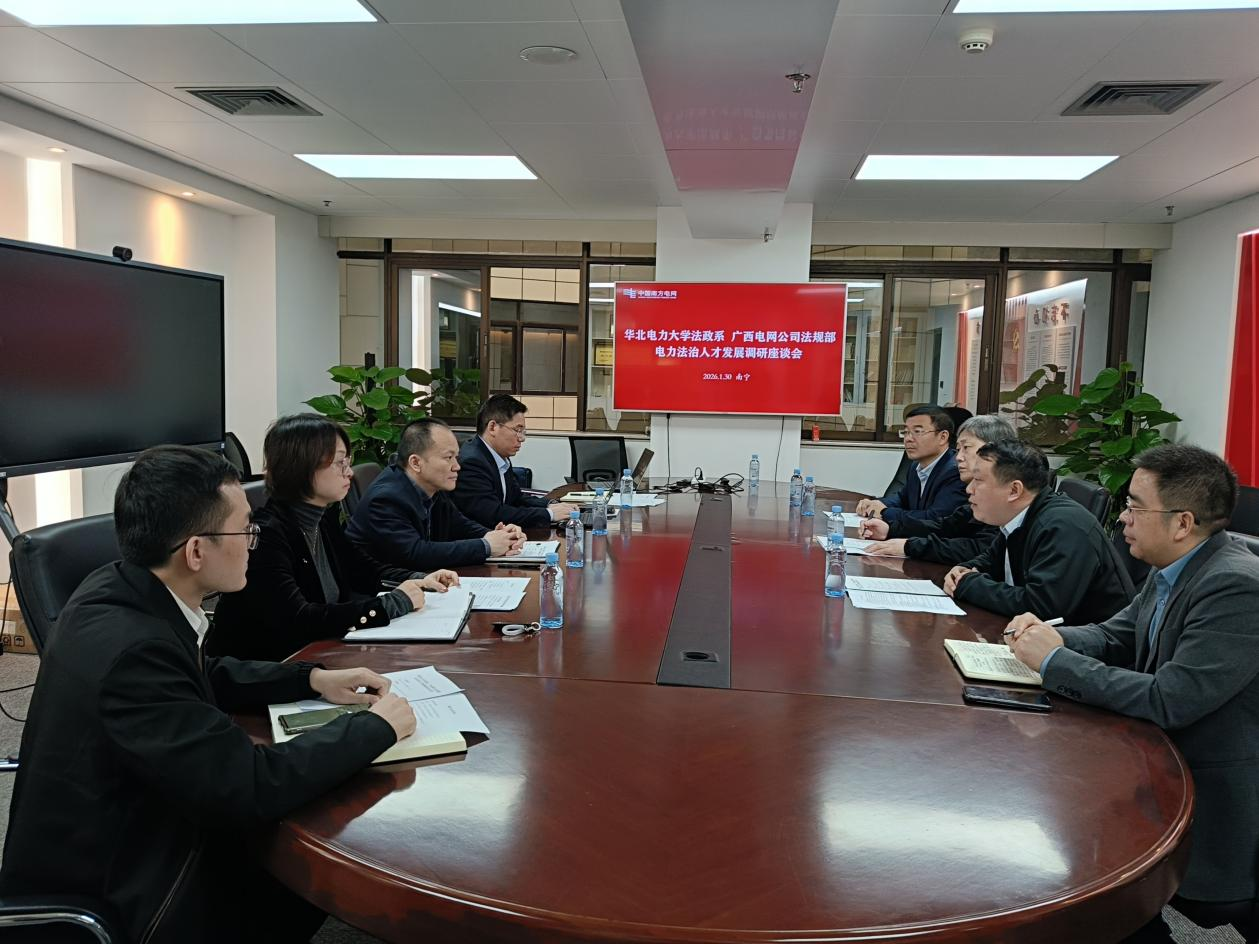 戴民介绍了我校的办学特色、发展历程以及法政系的学科优势。他指出,法政系法学专业立足能源电力行业根基,深耕法治人才培养与行业法律服务,期待通过此次交流,搭建校地协同、产教融合的坚实桥梁。罗军全面介绍了广西电网公司法治人才队伍建设的基本情况,包括公司法律人员中来自华北电力大学学生的发展情况,并就“十五五”法治人才建设形势和目标进行分析,从提升法学专业校园招聘质量、促进内部人才流动、强化校企联合培养等角度,进一步强化公司法治人才队伍建设。赵月星介绍了广西电网公司招聘工作、人才管理相关情况。双方围绕电网公司法学专业用人需求与人才培养、法学专业培养方案修订、能源电力特色改革、教学实践基地建设等方面开展深入交流。