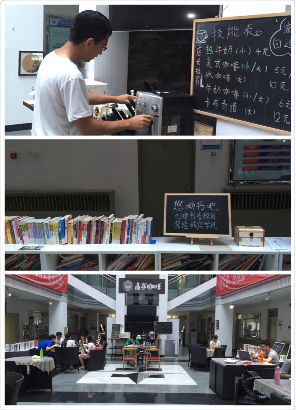 “诚信咖啡吧”是学校利用本校的专业优势,以支持学生自主创业的形式于2014年11月创办,位于华北电力大学大学生综合服务中心一层。咖啡吧的运营主题是“为诚信买单”,特色是建立了“五自四无”的诚信自助售卖体系。“五自”是指消费者拥有自选咖啡品种、自助现磨操作、自取咖啡、自主交费的自由感受。“四无”是指在咖啡吧里无专门的咖啡技师,消费者只需按照咖啡吧的制作流程调制咖啡即可;无收银员,需要秉着诚信的态度自觉投币;无需一次性交费,如果购买咖啡时现金不足,可以先喝后付费;无人监督。