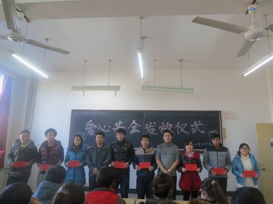 赵军伟在讲话中说,学院会尽力帮助每一位困难同学,同时希望同学们要自强自立,经济困难虽然是客观现状,但步入大学的殿堂,则为改变这一现状提供了宝贵的契机。他希望同学们要努力学习,规划未来,提升综合素质和综合竞争力,以知识改变命运。赵老师鼓励同学们勇敢面对生活的考验,并从点滴小事中感受爱心、学会感恩,在将来等自己有能力的时候也努力去回报母校、帮助他人,把爱心继续传递下去。之后,赵军伟老师和李伯远老师为每位困难学生发放爱心基金,并合影留念。