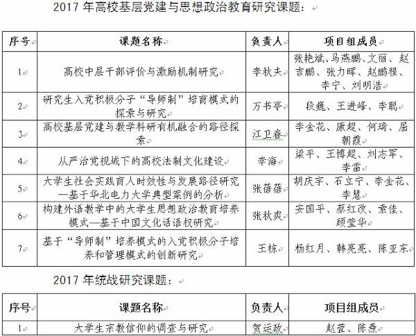 本网保定讯:为全面推进学校基层党组织建设和学校统战工作,积极探讨解决基层党建工作和统战工作中面临的突出问题,前期,党委组织部、科技处组织开展了2017年高校基层党建与思想政治教育研究课题、统战研究课题、基层党组织特色项目的申报工作。各单位申报了高校基层党建与思想政治教育研究课题13项、统战研究课题3项、基层党组织特色项目12项。