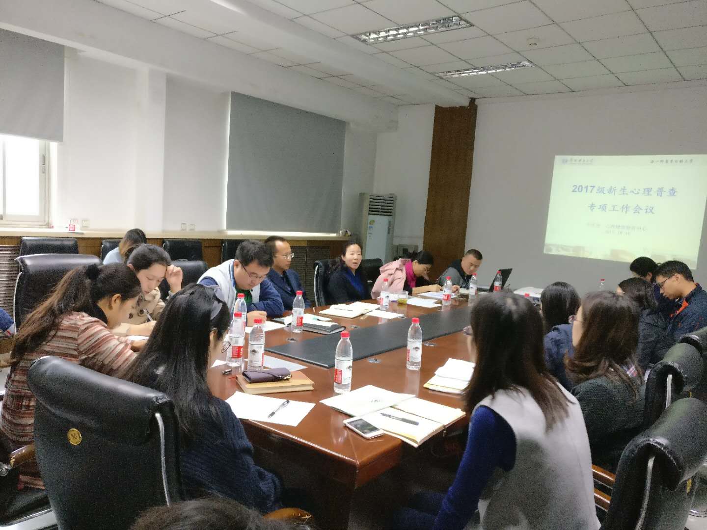 为确保普测的有序进行,心理健康教育中心组织召开2017级新生心理普测专项工作部署会。学工部部长沈岚,研工部部长李林,学工部副部长、心理健康教育中心主任卜春梅,心理健康教育中心全体教师、各学院心理辅导员和新生辅导员参加会议。工作部署会上,中心三位老师就心理普测的重要性、测量问卷的特性和施测方案做了相关介绍。