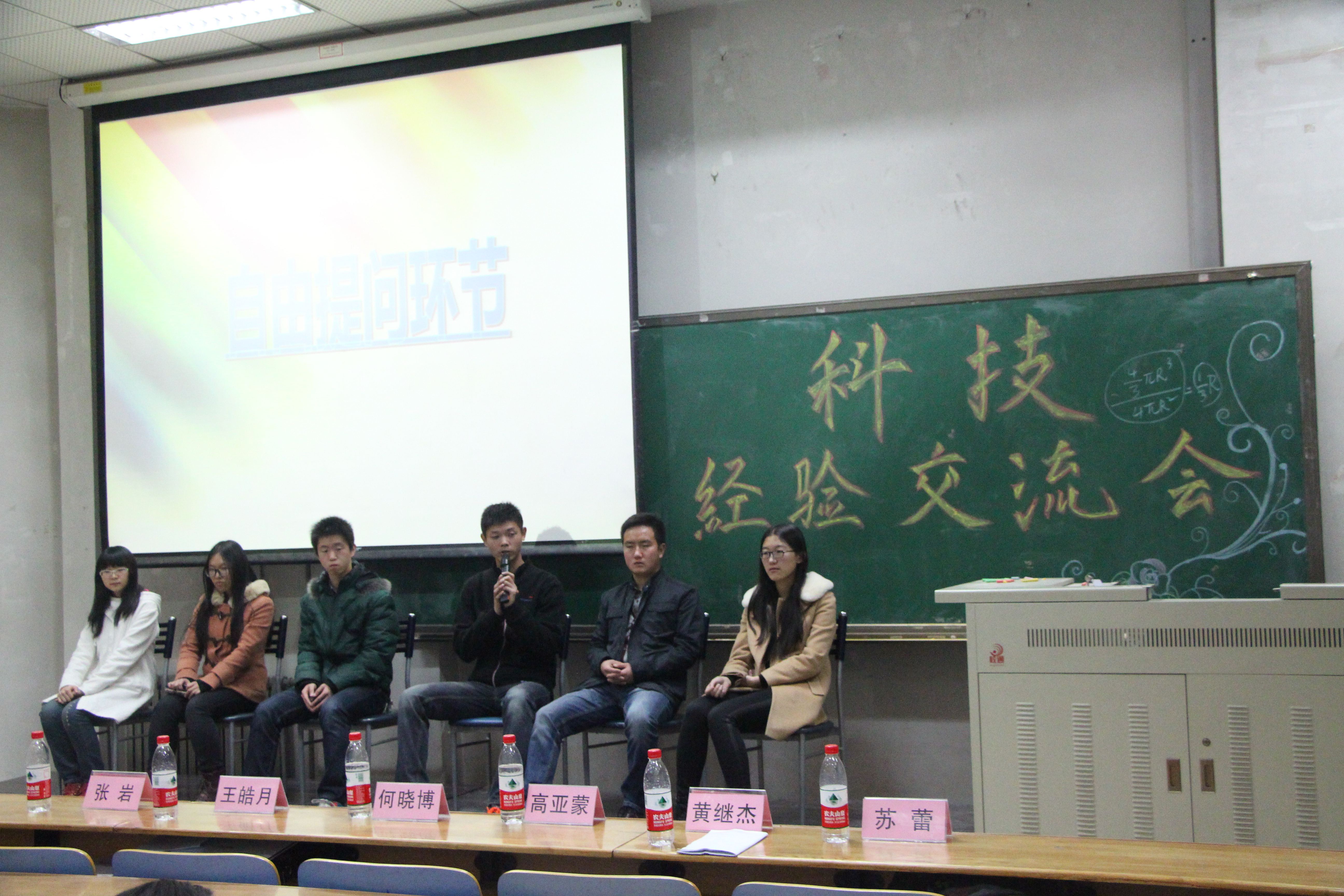 本网保定讯:3月15日晚,由经管系学生会、经管系科技创新协会主办的科技经验交流会在教十b101成功举办。苏蕾、黄继杰、高亚蒙、何晓博、王皓月、张岩六位在各项科技大赛中获得不俗成绩的华电学子作为嘉宾参加了本次经验交流会。