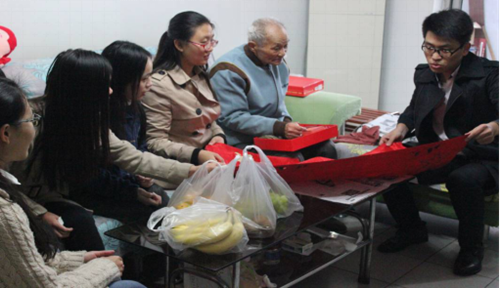 硕英141班党支部、硕英语131班党支部和英语系学生党支部的学生党员也开展了敬老帮扶活动。三个支部的党员代表们拜访了我校的退休老干处的丁保康老院长。正逢深秋,天气渐冷,路上还有小雨,但大家怀着一颗崇敬的心,热情的去丁爷爷家里拜访。