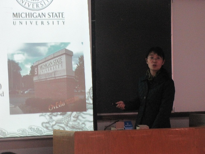 接下来由今年十月份刚刚结束交流回国的岳莹作报告,她用流利的英文全程解说了本次的交流成果。她首先介绍了此次出国访问的顶尖的公立研究型大学,被誉为“公立常春藤”大学之一的密歇根州立大学的地理位置以及校园环境情况,然后说明了密歇根州立大学在全美高校中的学术地位,特别是工程学院在全美电子工程名列前茅,并且详细介绍了自己在密歇根州立大学主要从事的教学和科研工作,并表示在访问交流中受益匪浅,不仅开阔了视野,也开拓了自主科研的能力。