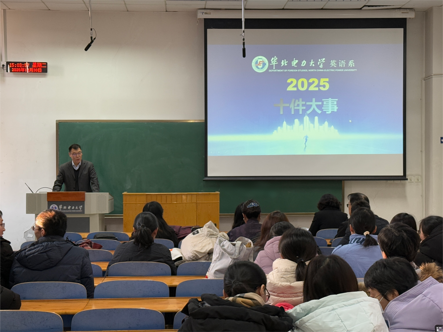 大会伊始,系党委书记武彦军带领全体老师共同回顾了“英语系2025年十件大事”。他指出,过去一年全系上下凝心聚力、攻坚克难,坚持以党建为统领,推进深入贯彻中央八项规定精神学习教育,扎实开展“攀峰行动”,引导全体教职工筑牢思想根基、强化责任担当,形成了风清气正、干事创业的良好氛围。教学工作亮点纷呈,科研工作持续发力,学术交流氛围浓厚,校企合作纵深推进,学生培养平台不断拓展,特色育人体系日趋完善。新的一年,英语系要百尺竿头,更进一步,深入学习贯彻党的二十届四中全会精神和学校第三次党代会决策部署,彰显语言学科担当,为建设能源电力特色世界一流大学贡献力量。最后,武彦军代表系领导班子,向全体教职工致以诚挚的新年祝福,祝愿大家在新的一年里工作顺利、身体健康、阖家幸福!