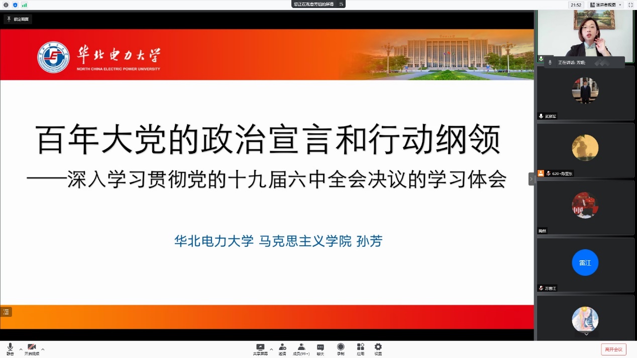 本网保定讯:为进一步学习贯彻党的十九届六中全会精神,1月4日下午,英语系邀请马克思主义学院孙芳教授通过线上开展十九届六中全会精神专题讲座。此次活动由英语系党总支书记武彦军主持,英语系全体教职员工、学生党员聆听了讲座。