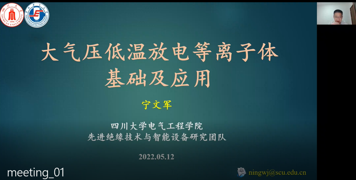 宁文军做了题为《大气压低温放电等离子体基础及应用》的学术报告。大气压放电等离子体是高电压技术与等离子体物理交叉的新兴科技领域。在合适的控制参数下,等离子体的宏观温度可接近室温,而其内部包含大量的高能电子以及高氧化还原电位的活性粒子,因此在生物医学、材料加工处理、能源化工等诸多领域展现了巨大的应用前景。本次报告宁文军简述大气压低温放电等离子体相关的基本概念、产生装置、基本物理过程、典型应用等。