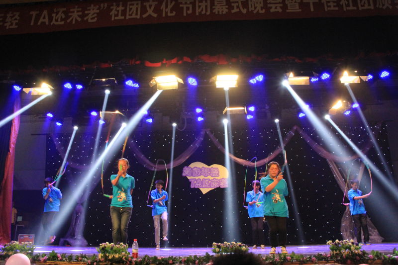 5月7日晚,第十一届社团文化节“趁你年轻,TA还未老”闭幕式晚会暨十佳社团颁奖典礼在教三报告厅隆重举行。绚丽的灯光亮起时,作为暖场节目,The wonderwall乐队为同学们带来了《向阳花》《火车日记》两首青春洋溢的歌曲,摇滚与活力点燃了现场的气氛。此次晚会以王子公主的爱情故事为背景,将各社团精彩的节目随着故事情节展现给现场观众,摩登舞协会带来节目《摩登皇家舞会》作为整场晚会的开篇,绚烂的灯光在舞台上来回奔袭,六对身着华服的同学在灯光下翩翩起舞,优雅的舞姿让观众们沉醉;接下来是时尚艺术团的节目《时尚走秀》,闪亮的服装、标致的模特、耀眼的灯光交织在一起,为观众带来美的盛宴;武术协会带来的《武动青春》一展阳刚之美;随后,魅影魔术团为大家带来了神秘有趣的魔术表演《心灵魔术》。魔术师诙谐幽默的语言以及精湛的技艺将晚会推向了第一个高潮。而随后英语协会、希望手语社、清风轮滑社、汉服社以及逐影双节棍协会均带来精彩的演出,毽绳协会的《毽绳舞蹈》伴随着欢快动感的配乐、青春俏皮的舞蹈、层出不穷的高难度毽绳动作为毽绳协会博得了热烈的掌声,该节目也在随即开始的运动会开幕式上表演,成为当晚最受欢迎节目。